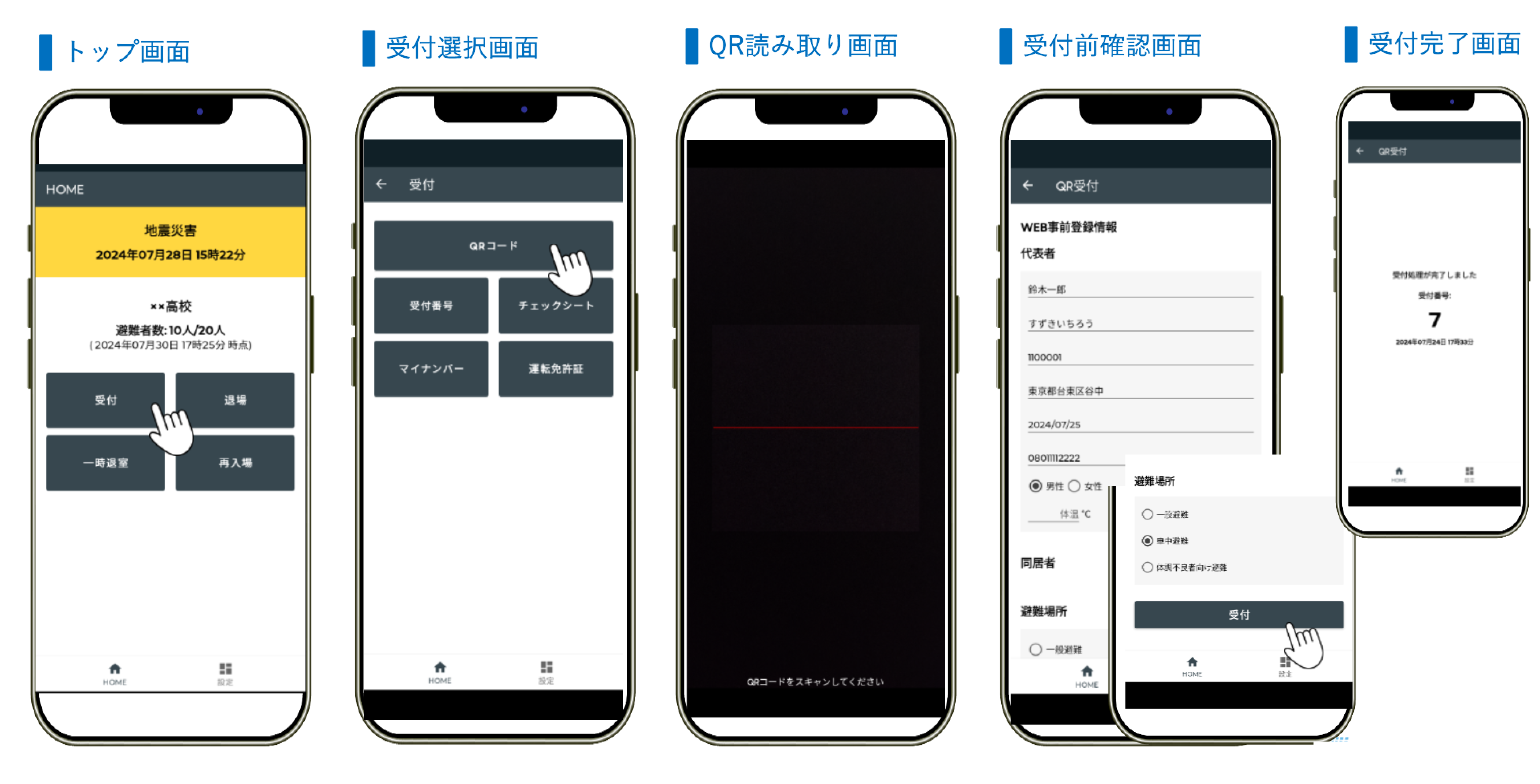 受付方法には4つの方法を用意しています。QRコード、マイナンバーカード、運転免許証、もちろん受付用紙での情報登録も可能ですので、用途に合った受付ですぐに避難所へ入場ができます。 -