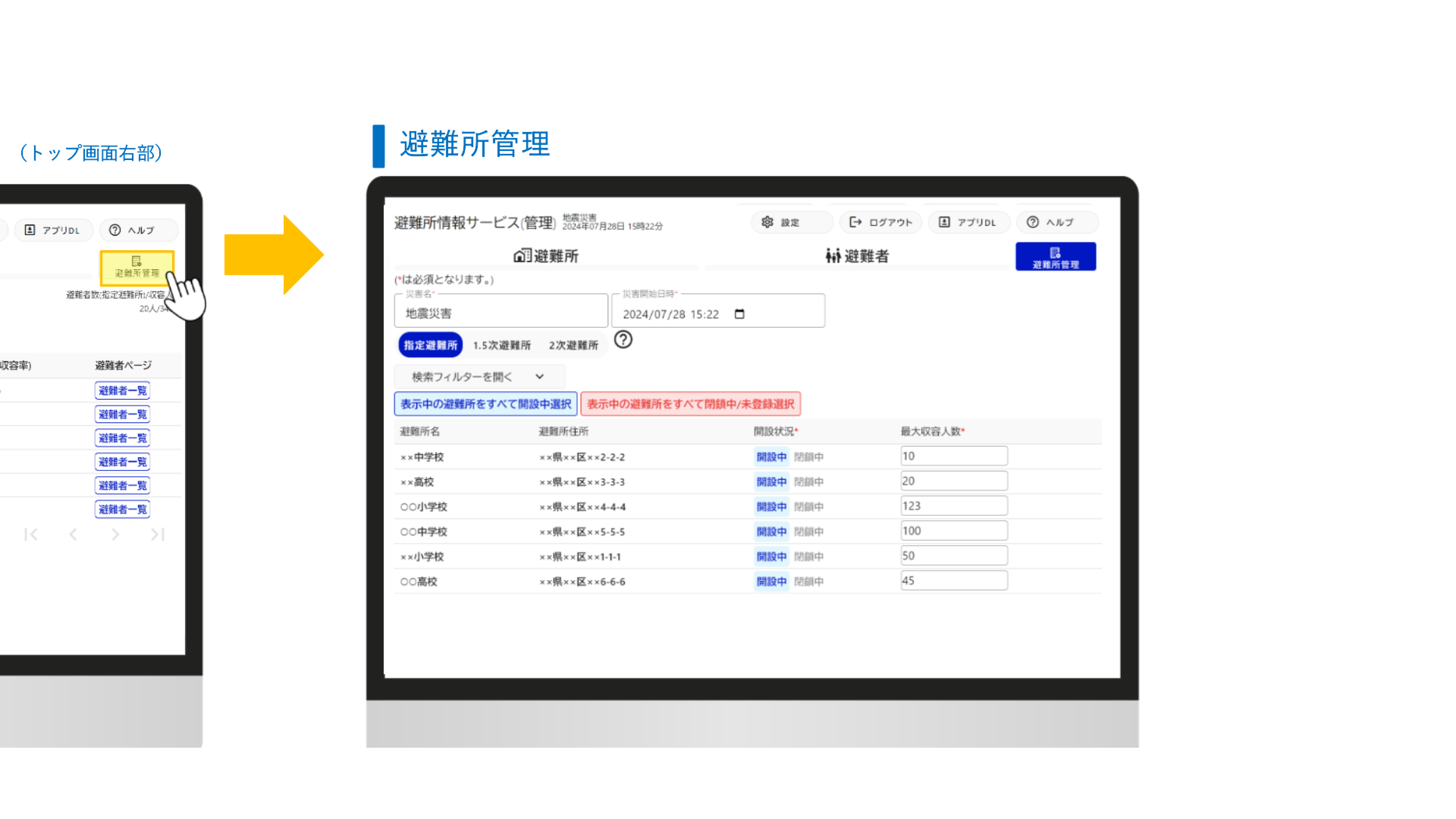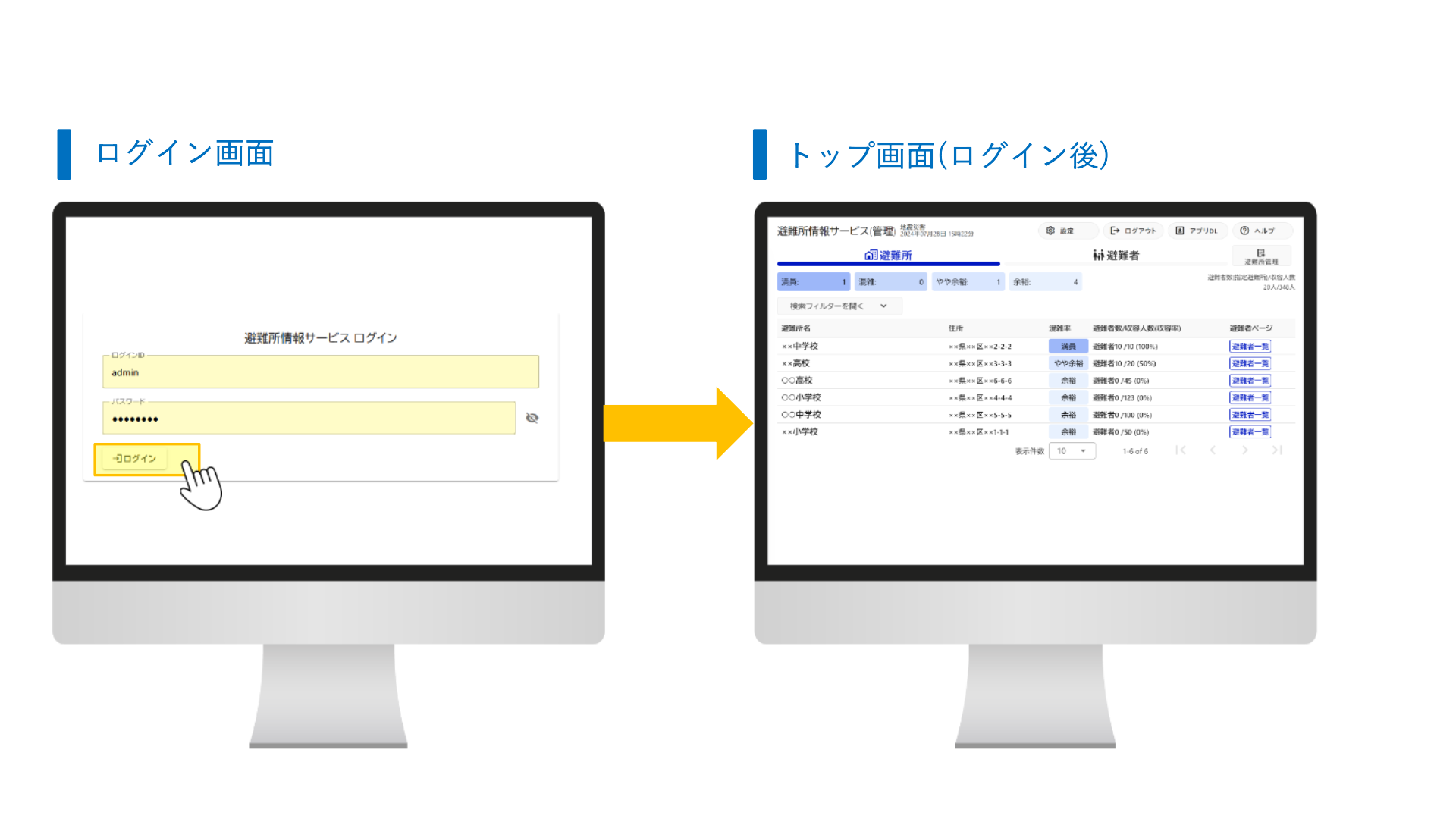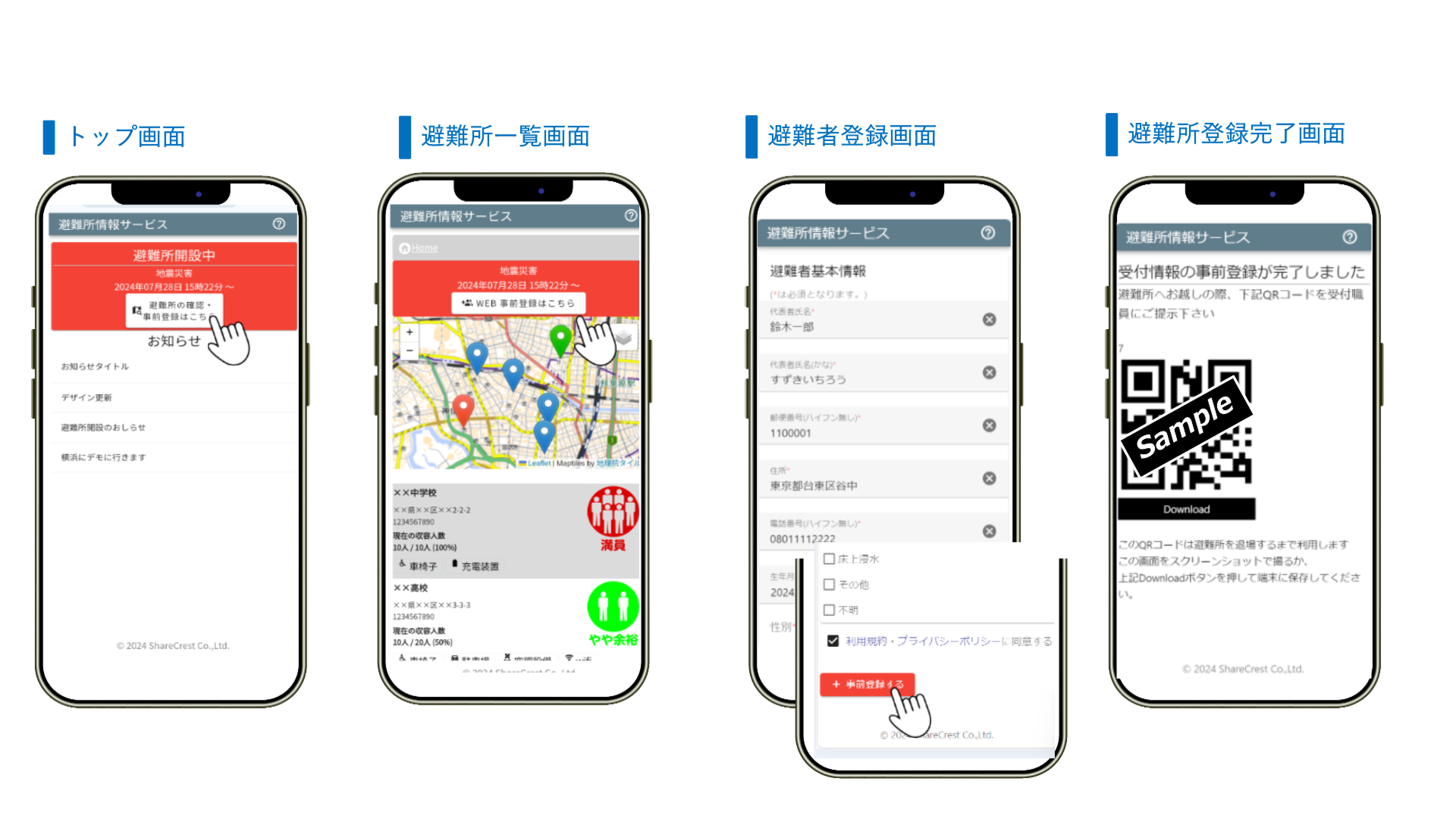 避難所に避難をする住民様向けの機能をご紹介します。災害時、住民様にはシンプルな受付、避難所の状況を公開し、より安心した避難ができるような機能をご用意しました。