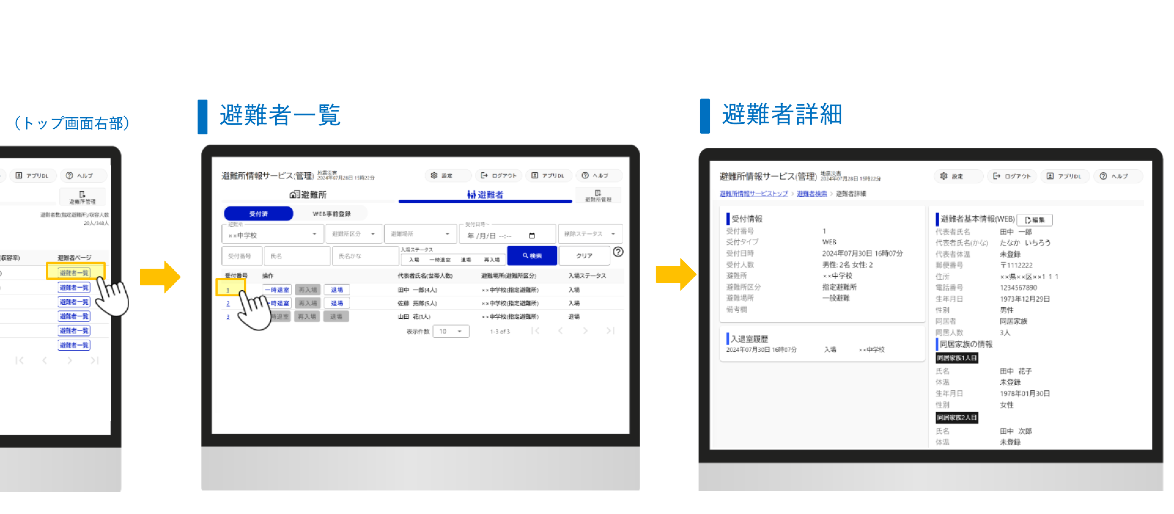 避難所を運営する自治体様向けの機能をご紹介します。災害時、住民の個人情報を取り扱う自治体様には、普及しつつあるマイナンバーカードにも対応し、より見やすく、操作性の高い機能をご用意しました。
