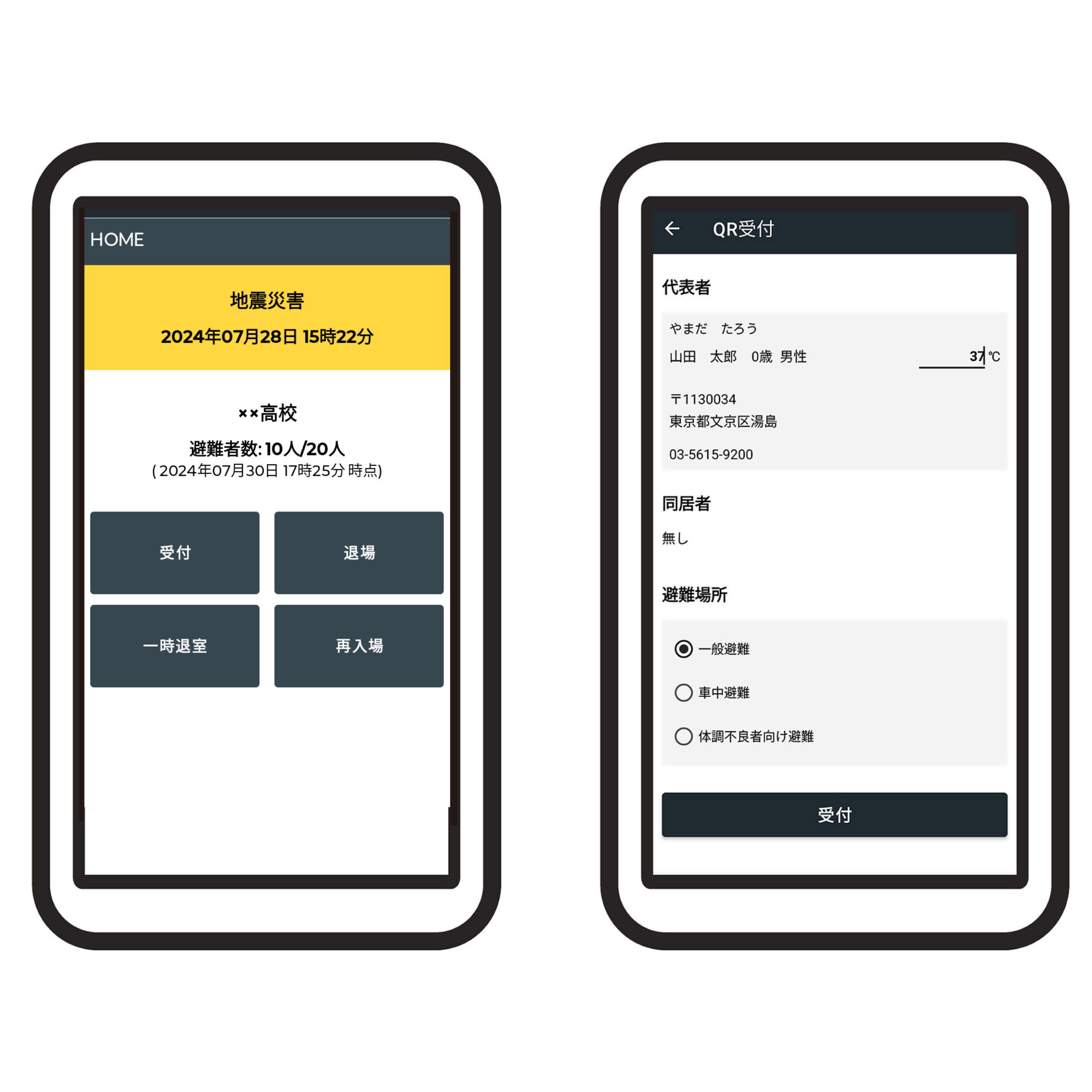 1. 多彩な入退場を可能にしたアプリ 2. 避難状況の報告業務を簡単に 3. 避難所の混雑状況をリアルタイムデータで提供